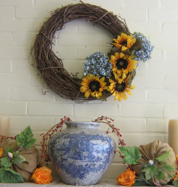 I moved the candlesticks with beeswax candles –added a couple more candles, the burlap pumpkins, orange paper roses – remnants from my daughter’s wedding and a couple of blue and white small urns to balance the larger urn.