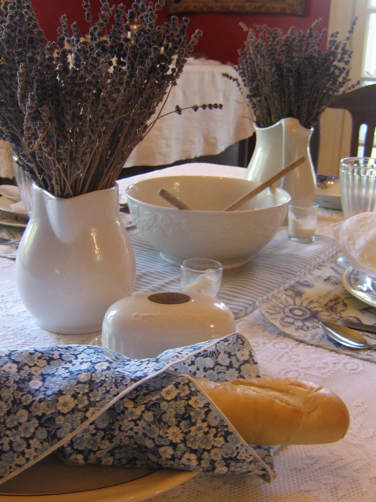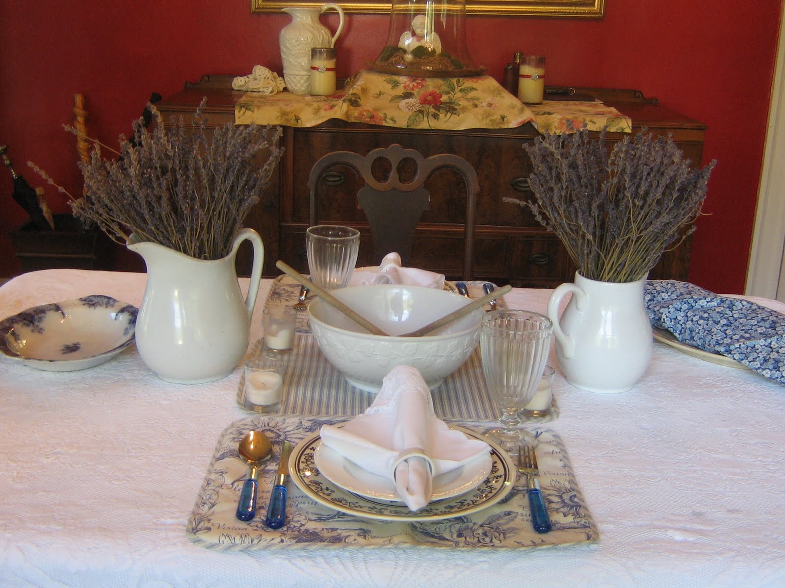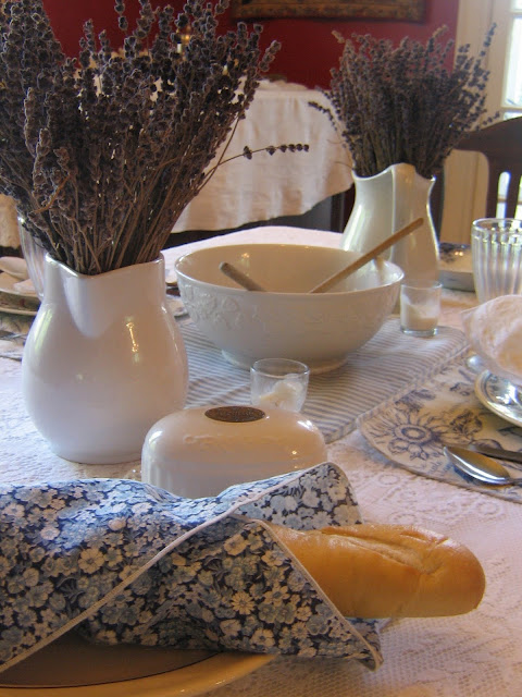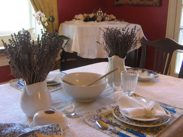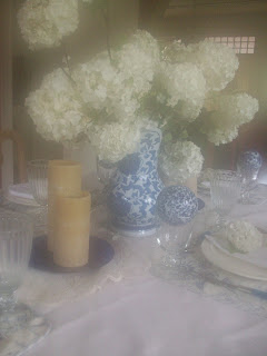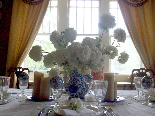 I chose to use my blue and white pitcher – so, with the white of the snowballs and the blue/white pitcher – this tablescape was dreamed up.
