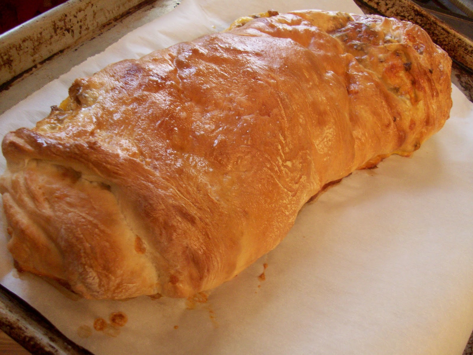 From the shortest side begin to roll up the dough - jelly roll style. Seal the edges and place dough seam side down on parchment lined baking sheet.
