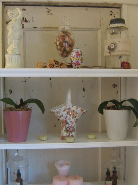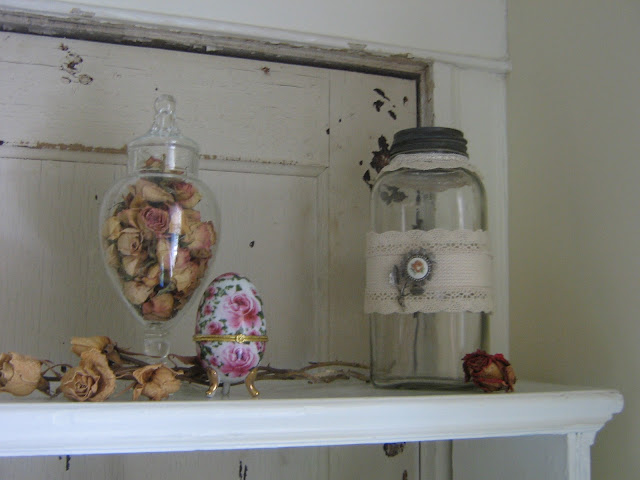 I placed it in our hall bathroom and plan to fill it with bath salts. I know I have a wooden scoop somewhere! The jar is next to an apothecary jar and a rose egg that I also found at Goodwill.