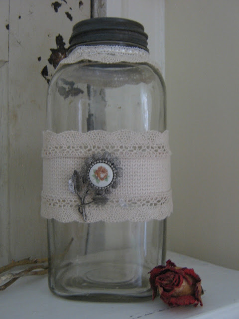 I have a varied assortment of old canning jars and bottles. I had it sitting on my desk for a couple of days and thought – embellish.