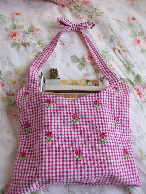 I shared with you earlier that I had made a couple of pillows from two little girls dresses. My daughter recognized the checked patter in the pocket pillow. I had intended to make another heart pillow out of the bodice, but seeing the scalloped top I got another idea. I saw that this could be made into a sweet little bag. I then thought I could take the same measurements from the other pocket on the skirt of the dress to make another tote/purse.
