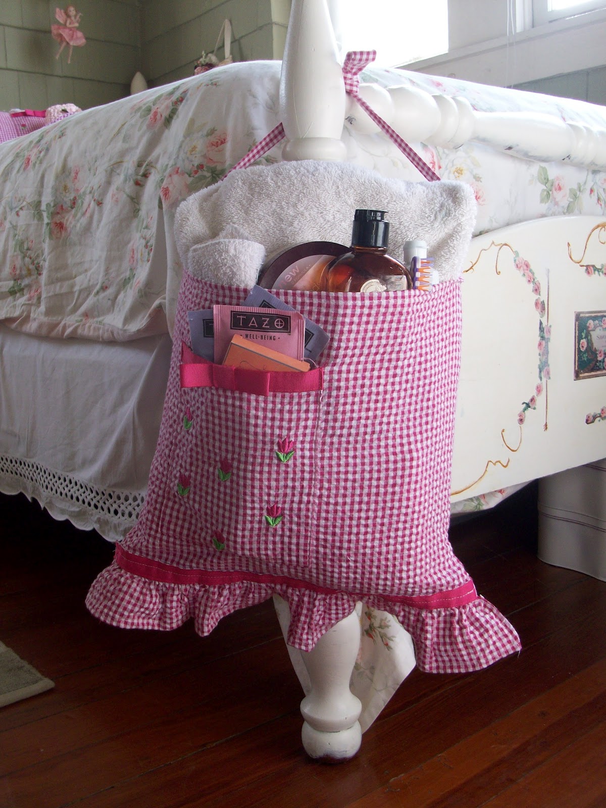 Then I realized these would make sweet bags to hold goodies for a guest. I took the ribboned band at the waste, included a couple of inches of the skirt to create a bottom ruffle to the pocket bag. I stitched together the bottom and the sides and added one of the tie-backs as a strap. I placed a towel, washcloth, gel soap, body butter, toothpaste and a toothbrush in the purse. In the pocket I put a bar of chocolate and some tea bags.