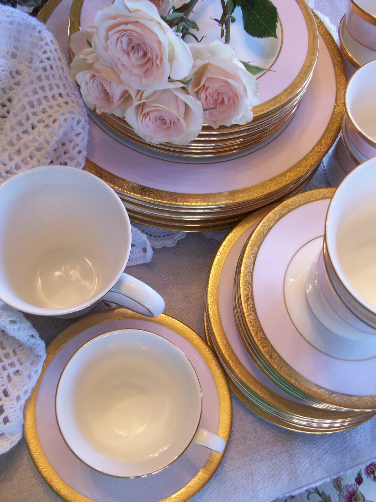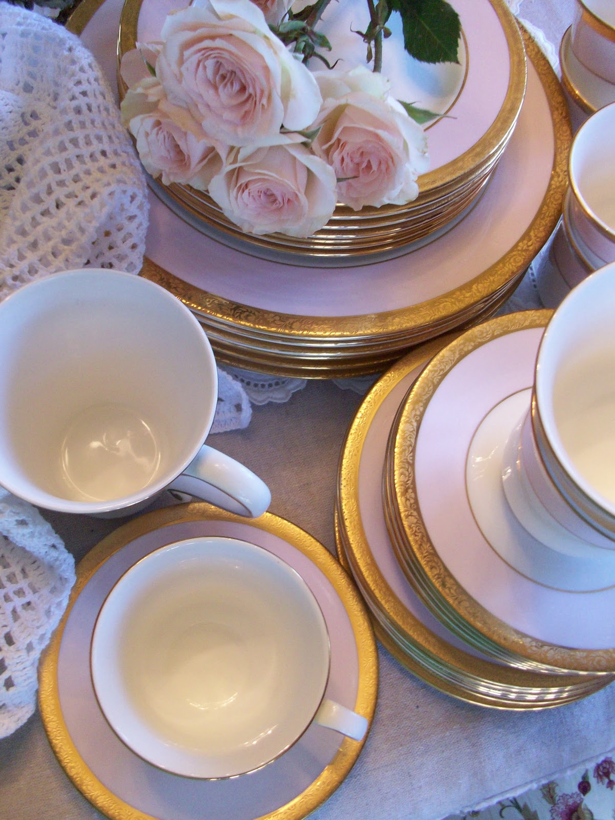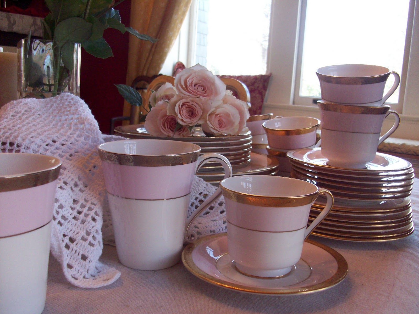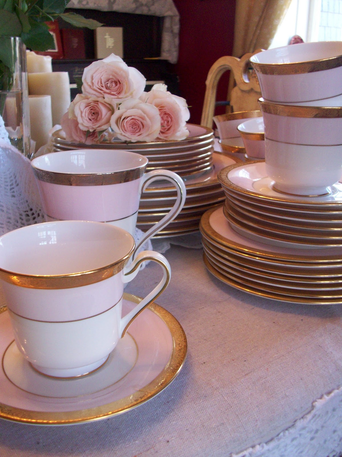 I have shared in the past the beautiful pink china my Mother-in-Law gave me several years back. She gave me a set of seven place settings. Seven, for the five of us five plus the grandparents! She likes it when I use them when they come over for dinner. I love collecting Mary Kay pink china!